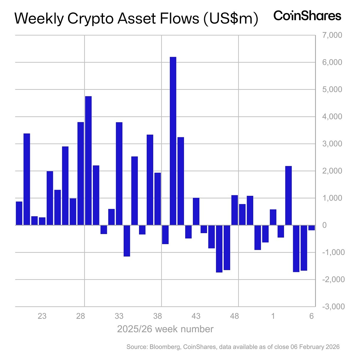 深潮 TechFlow 消息,2 月 9 日,CoinShares 發布最新周報表示,數字資產投資產品上周資金流出明顯放緩至 1.87 億美元,儘管價格承壓,但資金流出速度的減緩。報告顯示,管理資產總額降至 1298 億美元,為 2025 年 3 月以來最低水平。