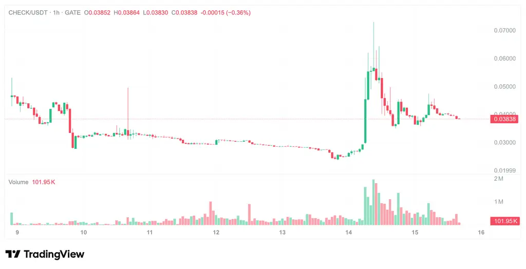 截至 2026 年 4 月 15 日,Gate 行情數據顯示,Checkmate (CHECK) 的交易活動呈現出顯著的高波動特徵。其單日價格在 0.03509 美元至 0.04978 美元區間內運行,價格振幅明顯。