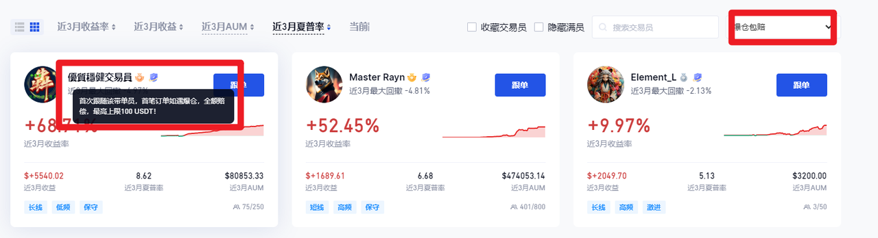 获得爆仓包赔资格的带单员,平台会在产品前端加上“包赔”标签,更易于跟单用户识别。同时,官方也会倾斜宣传资源给这些优质带单员,帮助其吸引更多跟单新用户。