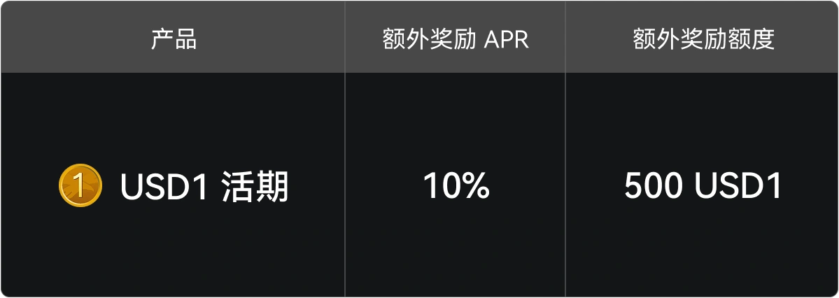 申购 USD1 活期理财享 10% 额外奖励年化加成,累计 10,000 枚 USD1 额外奖励池,先到先得。点此申购