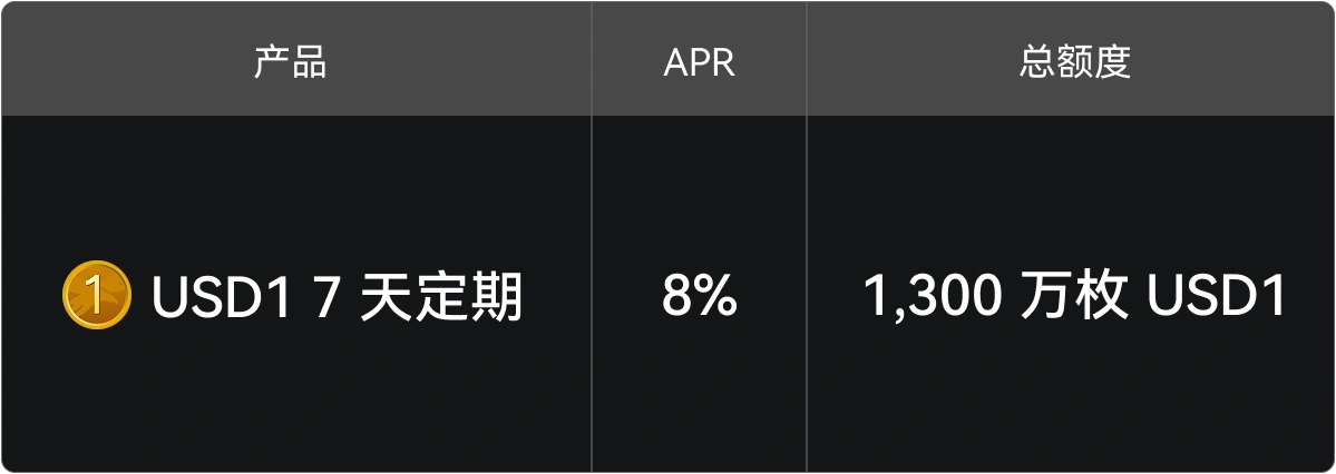 申购 USD1 7 天定期理财享 8% 年化收益,总额度为 1,300 万枚 USD1,先到先得。点此申购