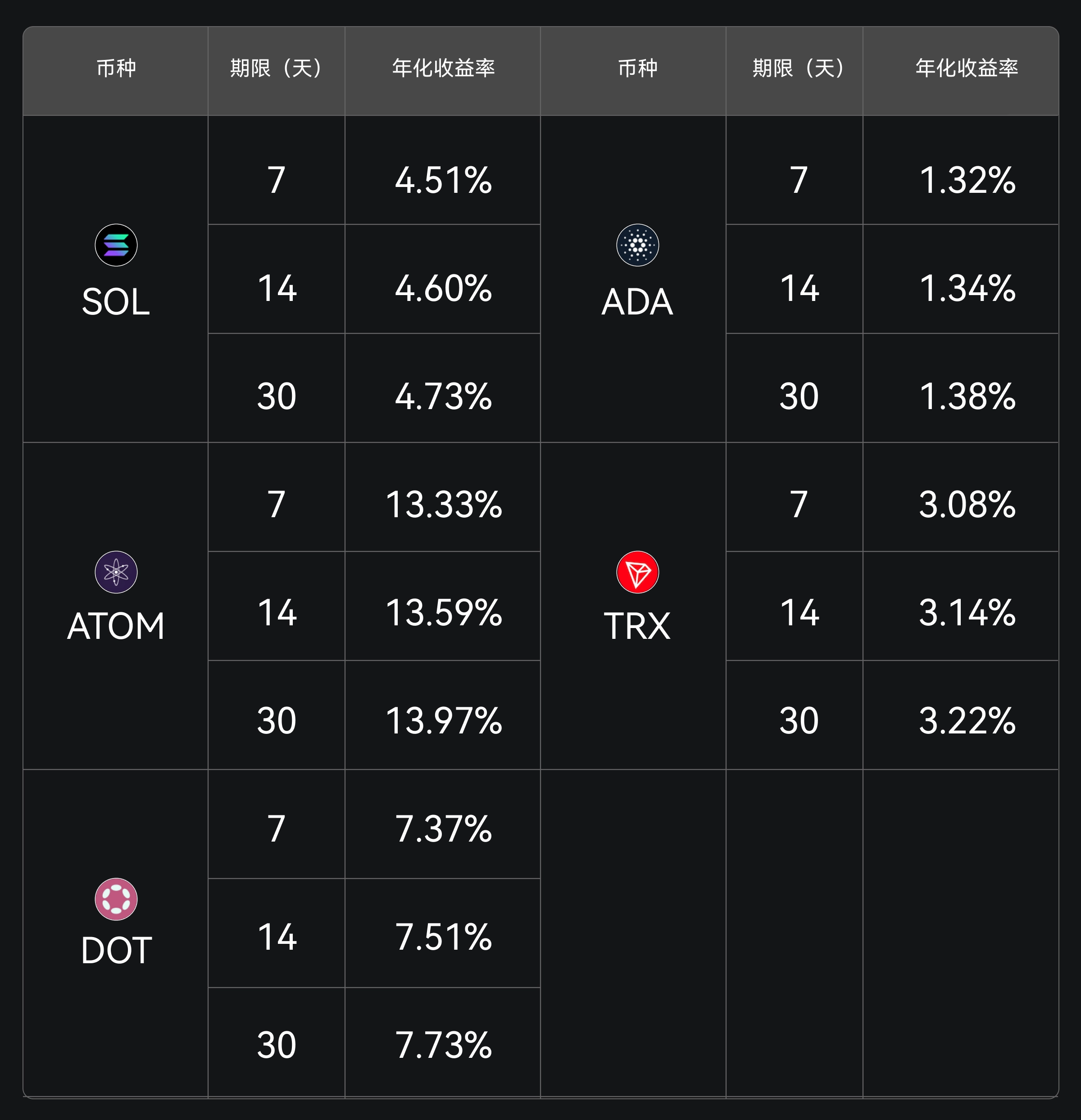 Gate 余币宝现已上线 SOL、ADA、ATOM、TRX、DOT 定期理财,提供 7 天、14 天、30 天三种锁仓周期,欢迎前往参与申购。