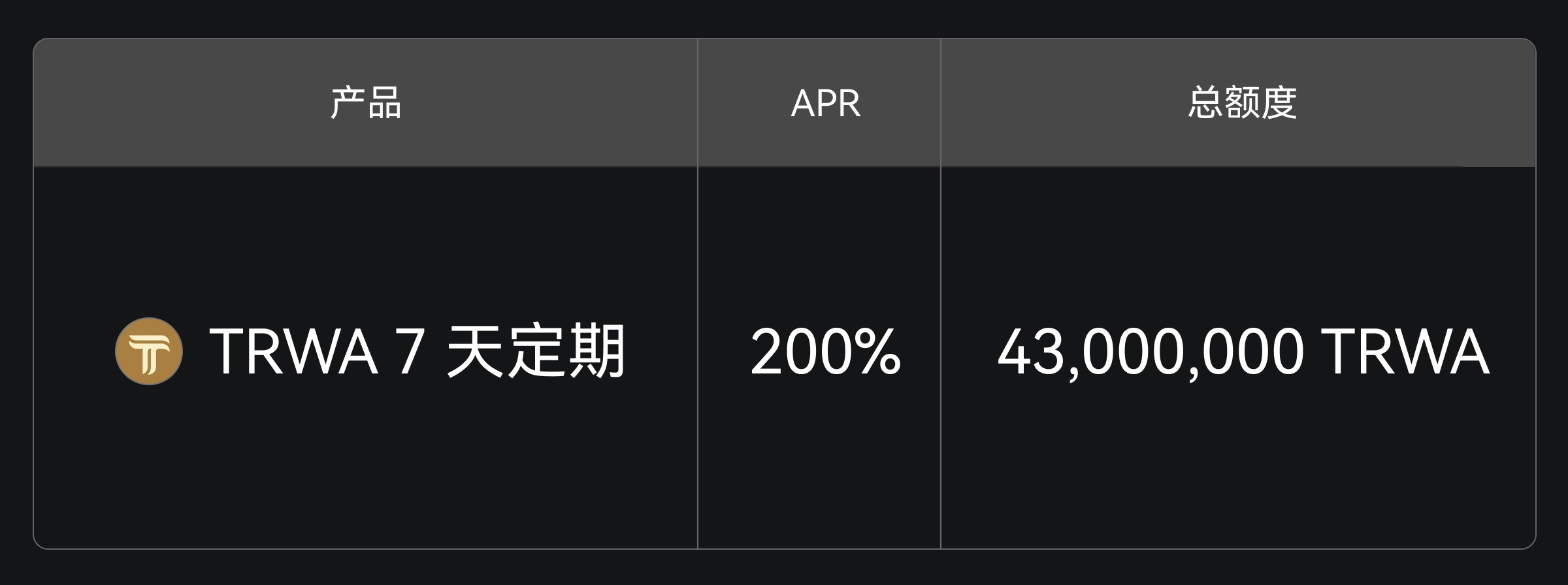 Gate 余币宝现已上线 TRWA 7 天定期理财,年化收益 200%,总额度 43,000,000 TRWA,限量发售,先到先得。