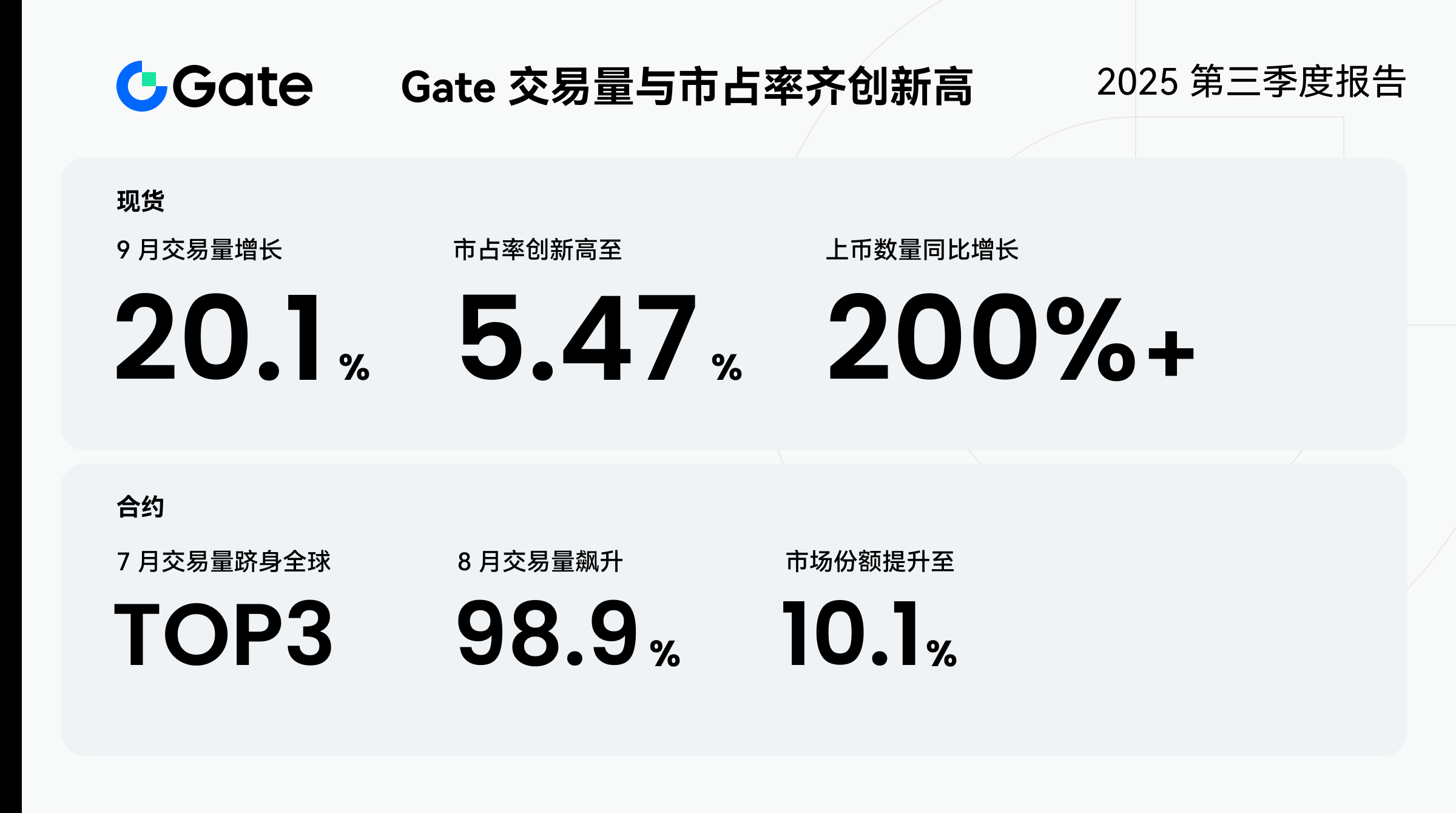 2025 年第三季度,Gate 持续优化产品结构与市场策略,合约业务保持高速扩张,季度交易量实现倍数级增长,市占率稳步提升至全球前列。交易规模的跃升得益于平台在撮合性能、做市机制与机构资金承接等方面的全面升级,使 Gate 成为高频与专业交易者的首选阵地,合约活跃度与市场深度持续领先行业。