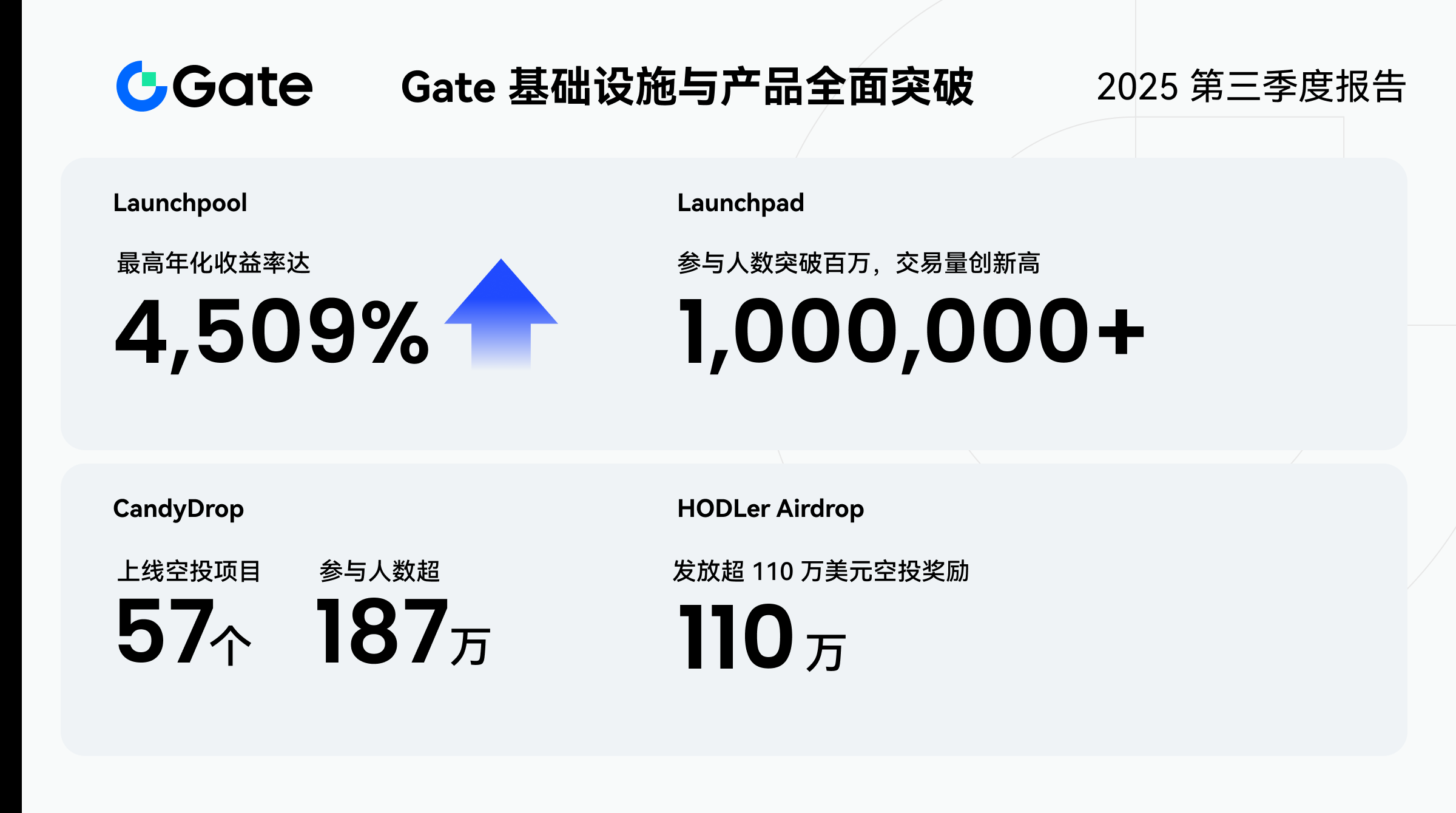 2025 年第三季度,Gate 在基础设施、产品矩阵与生态协同层面实现全面突破。核心基础设施 Gate Layer 正式上线,凭借高性能 OP Stack 架构与 GT 质押机制,构建安全高效的二层网络体系,推动 GT 生态价值重塑;依托该网络,Gate Perp DEX 与 Gate Fun 等创新产品相继登场,分别在去中心化永续合约交易与链上发射平台开创全新体验。与此同时,Launchpool、Launchpad、CandyDrop 与 HODLer Airdrop 四大激励产品同步升级,高收益项目与灵活机制显著提升用户参与度与生态活跃度。