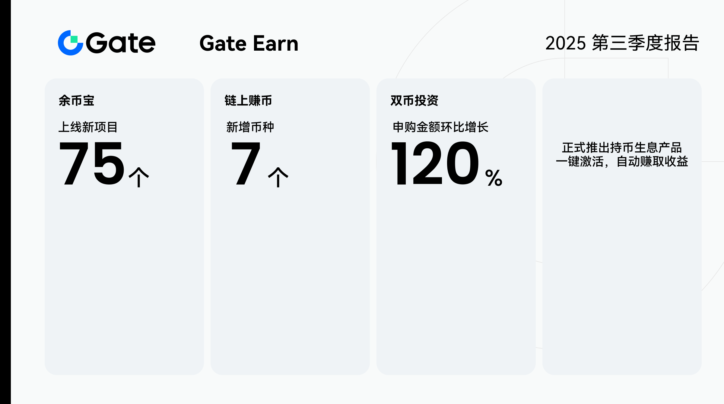 9 月正式推出持币生息产品,用户只需一键激活,即可通过现货持仓自动赚取收益,无需锁仓,资产依旧灵活可用。整体来看,Gate Earn 在产品供给、用户活跃与资产增长三方面实现协同提速,全面巩固其在 Gate 平台收益生态中的核心地位。