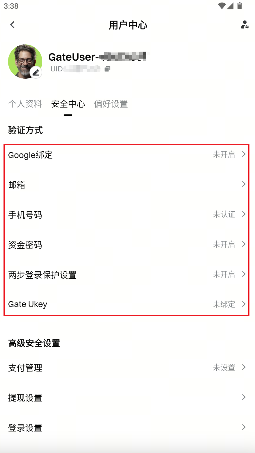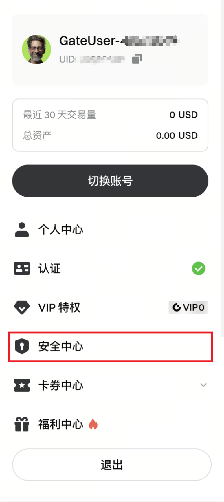 注册完成后,点击页面左上角的头像,点击进入用户中心,切换到【安全中心】tab。