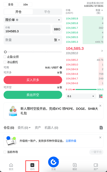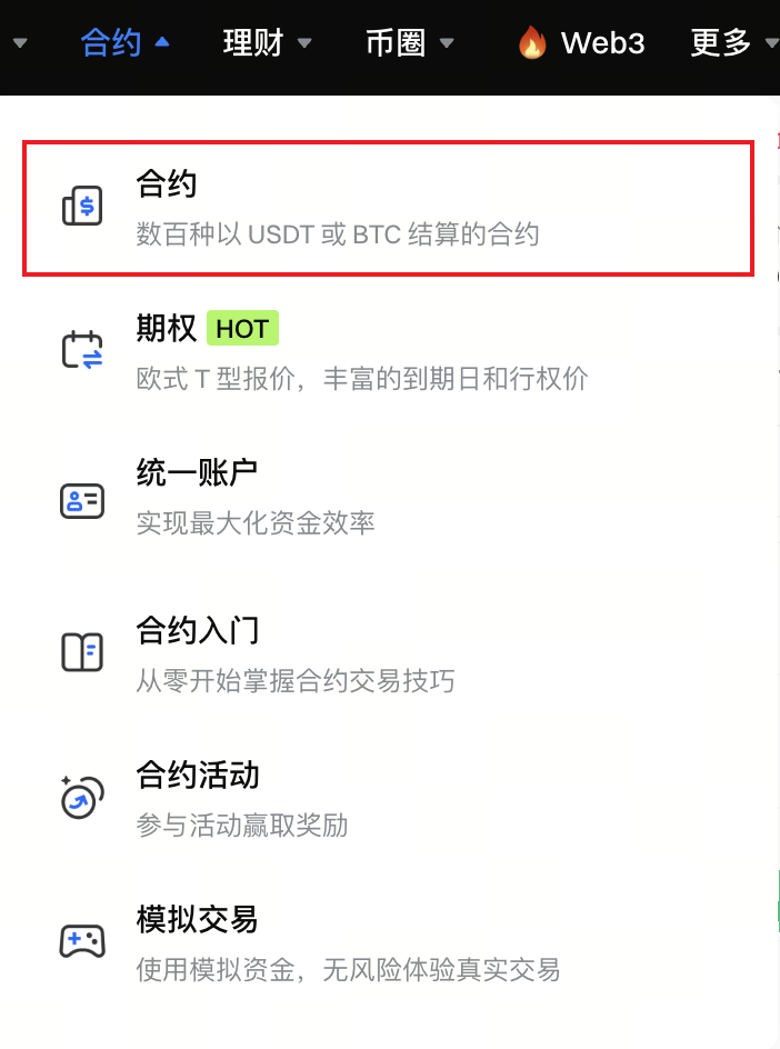 - 点击导航栏中的【合约】,进入合约交易页面。