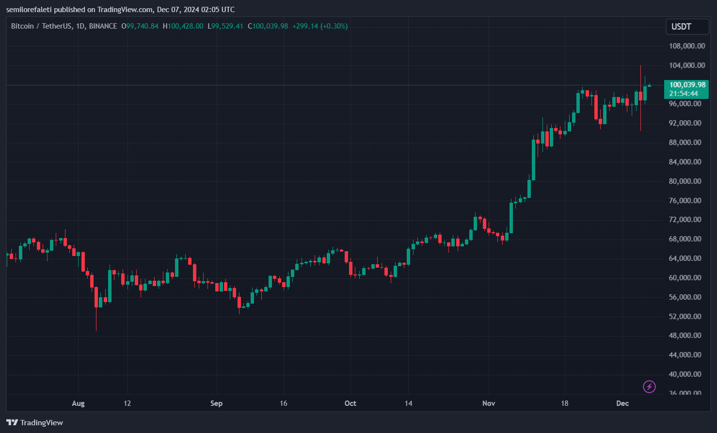 !BitcoinBTC 日线图交易价格为 100,039.98 美元 |来源:Tradingview.com 上的 BTCUSDT 图表来自 CNN 的特色图片,图表来自 Tradingview