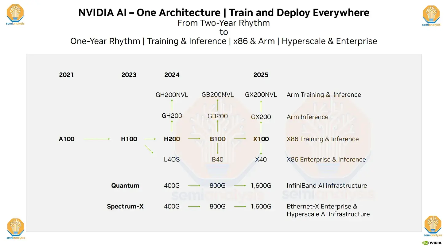 展望未来,NVIDIA 披露了 X100 芯片的计划,计划于 2025 年发布,该芯片将扩大产品范围,包括企业用途的 X40 和 GX200,在 Superchip 配置中结合 CPU 和 GPU 功能。 同样,GB200预计将效仿B100,融入超级芯片概念。