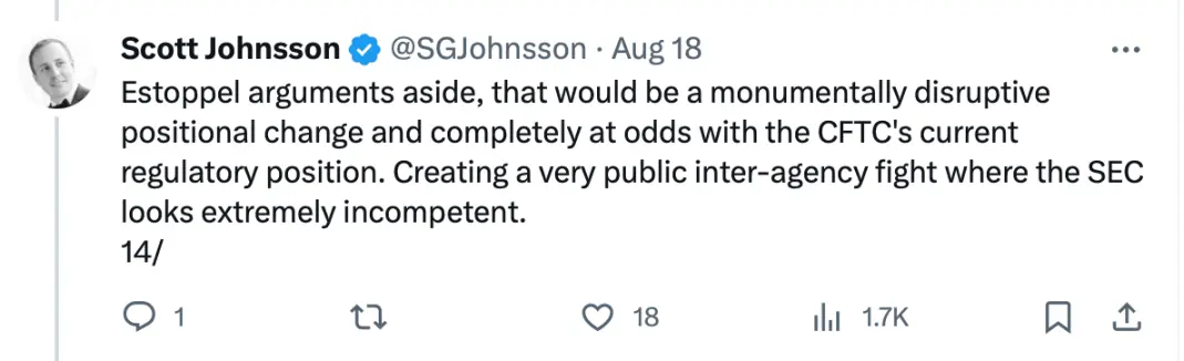 考虑到芝商所以太坊期货市场和多个基于期货的以太坊 ETF 的存在,批准的逻辑似乎相当可移植。甚至美国对以太币的监管方法和处理也是建立在非安全基础上的。由于多种原因,Gensler 或未来的监管机构不太可能放弃之前的处理方式(参见带图片的线程)。