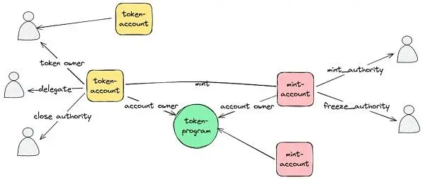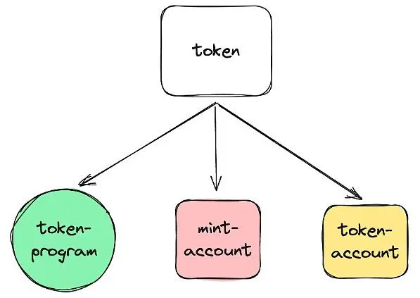由于 programs 是无状态的,所以 token 并不能只在单个账号中实现,token 主要由这几部分组成,token-program, mint-account 和 token-account。简单地说,发行一个 token,就是创建了一个 mint-account,接收一个新的代币,就是创建了一个 token-account。