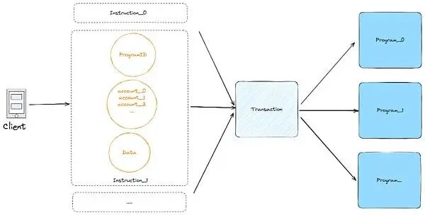 下图是 Solana 智能合约的调用示意图,和以太坊的智能合约不同的是,Solana 一个 Transaction 里可以通过 Instruction 调用多个 Program。客户端调用 Program 时,首先需要传入几个关键参数(Program ID, Accounts, Data) 来构造 Instruction,这个调用非常简单灵活,但也因此存在非常多的安全引患。