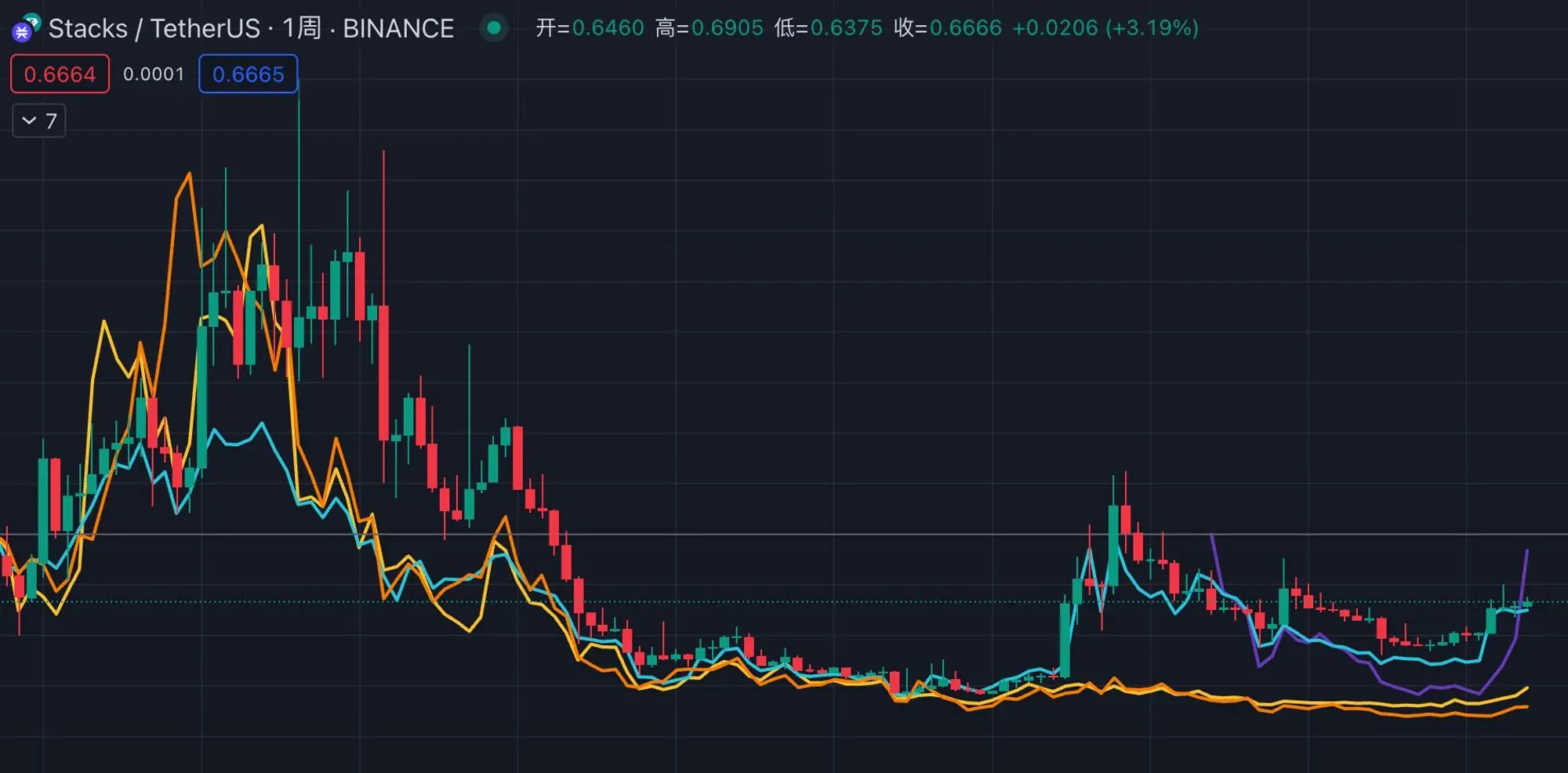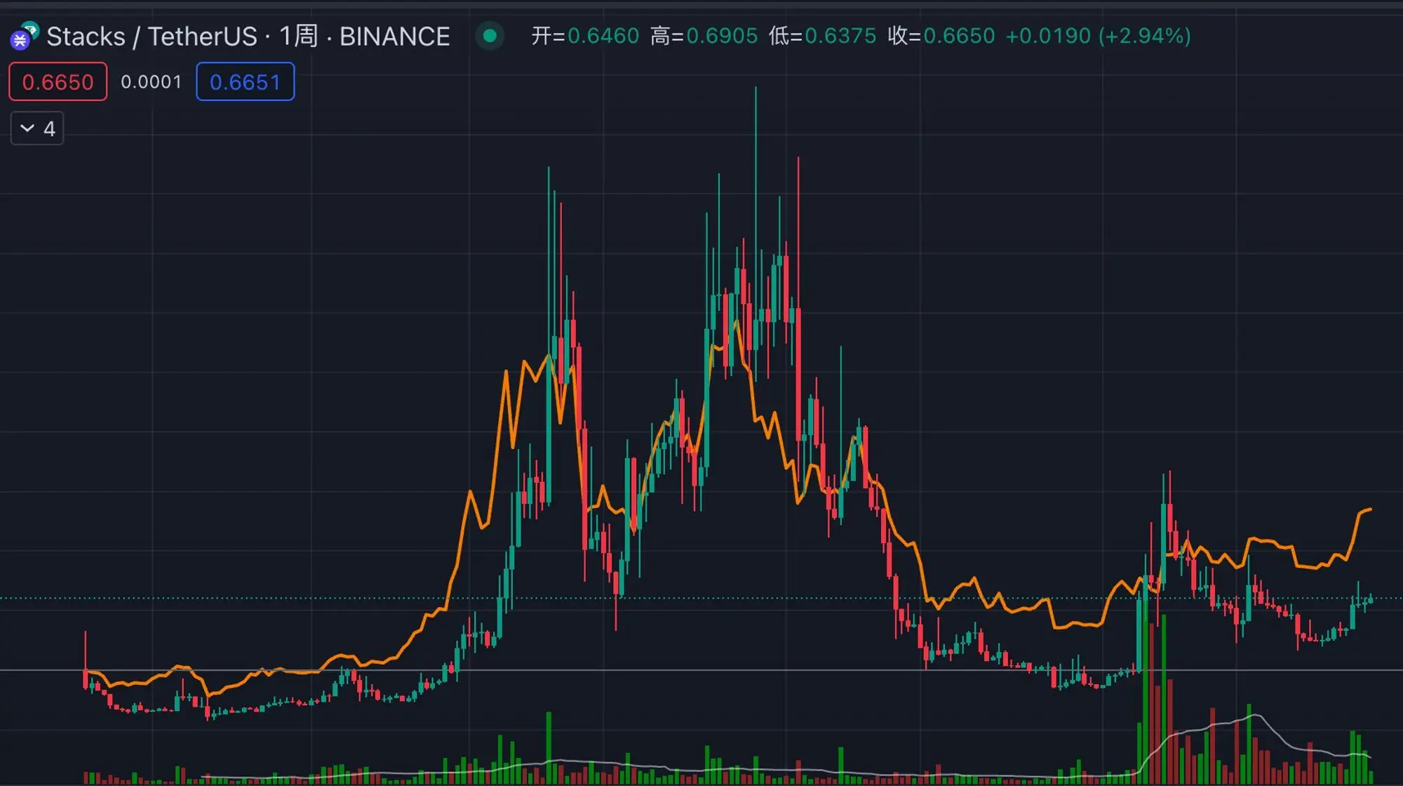 k 线为 STX/USDT,橙色线为 BTC/USDT,可以看出,不管涨跌,STX 的表现总是滞后于 BTC,且和 BTC 同涨同跌。