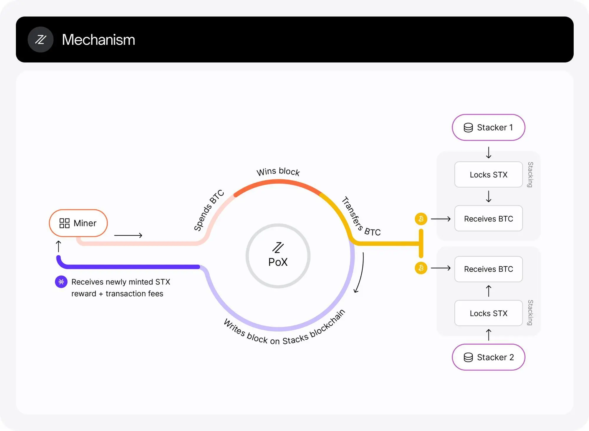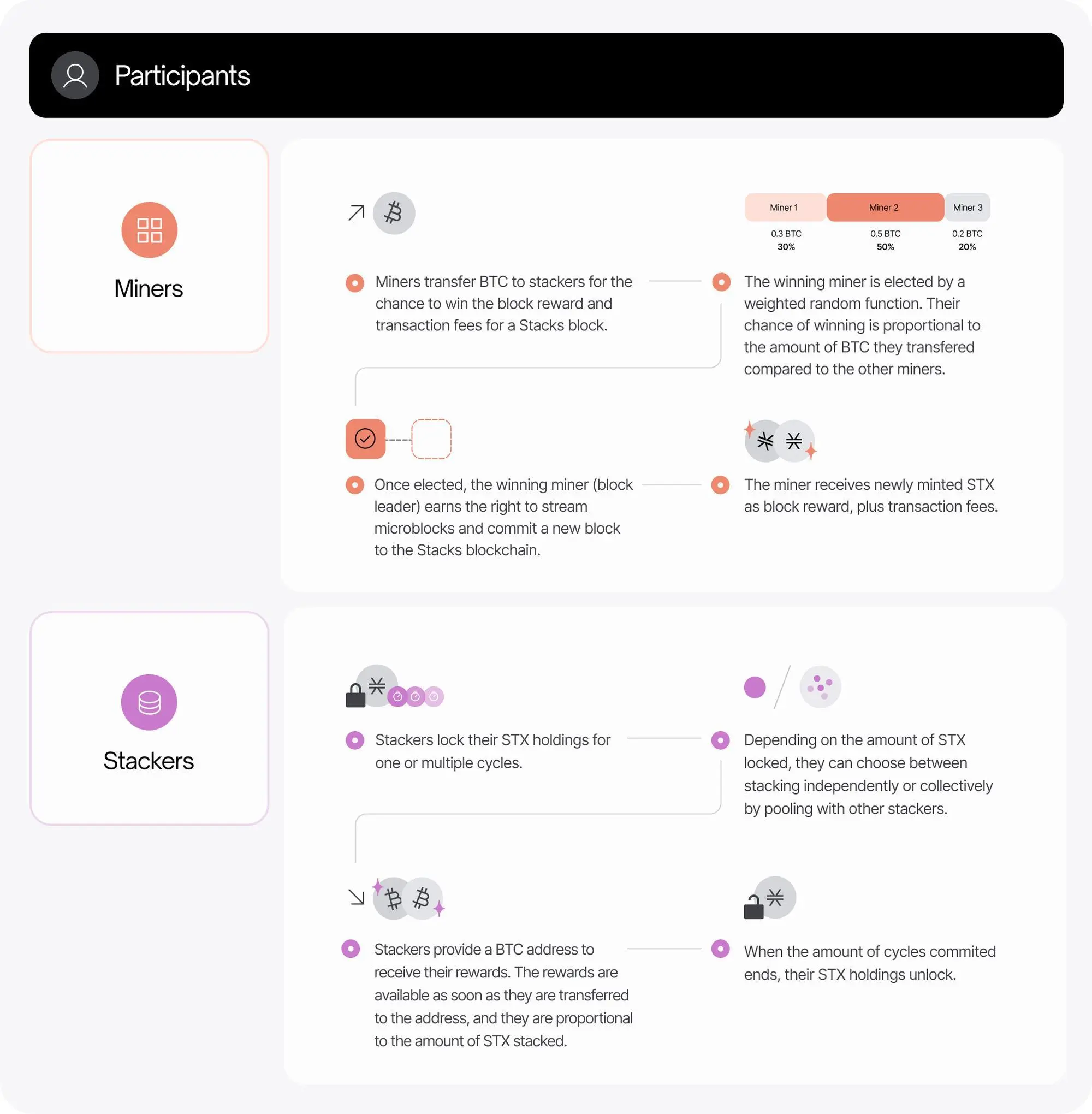 • Stackers:在一定时期内锁定一定数量的 STX 的用户。设置不同周期质押 STX →自建池子或加入其他池子→提供接收奖励的地址→ 根据质押 STX 的数量获得矿工的 BTC;