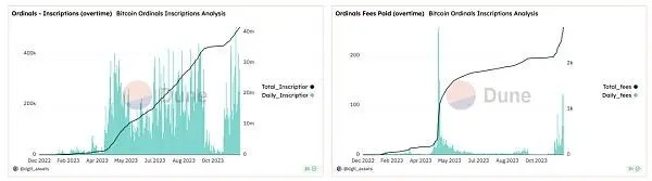 23年初,Casey在比特币主网上推出了NFT协议Ordinals。该协议允许识别和跟踪每个聪,并提供链上资产验证。**自推出以来,Ordinals彻底改变了比特币NFT的局面,交易量大幅增长,新的Ordinal NFT市场不断涌现。**截止11月19日,Ordinals铭文铸造超过4100万,铸造费用接近一亿美金。