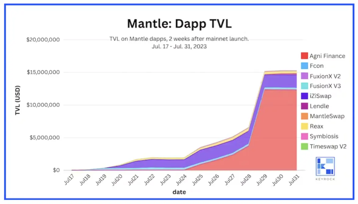 我们在 2023 年 7 月 17 日 Mantle 主网启动后的两周观察了应用程序 TVL。