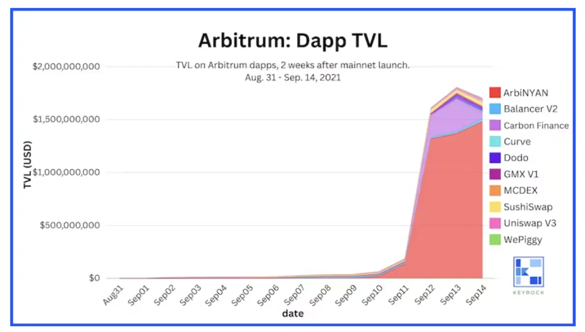我们在 2021 年 8 月 31 日 Arbitrum One 主网启动后的两周观察了应用程序 TVL。