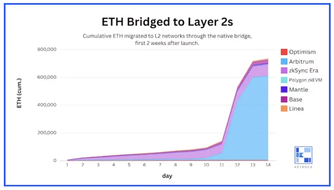 在 第 1 部分 分析中,我们观察了 ETH 在 L2 启动最初 24 小时及随后两周内从以太坊流入 L2 网络的情况。第 1 部分让我们了解了这些网络在获取流动性、关注度和早期采用方面的表现,并考虑到市场环境(熊市或牛市)、基础技术(ZK 与非 ZK)和品牌认知度的不同,我们得出了三个主要结论: