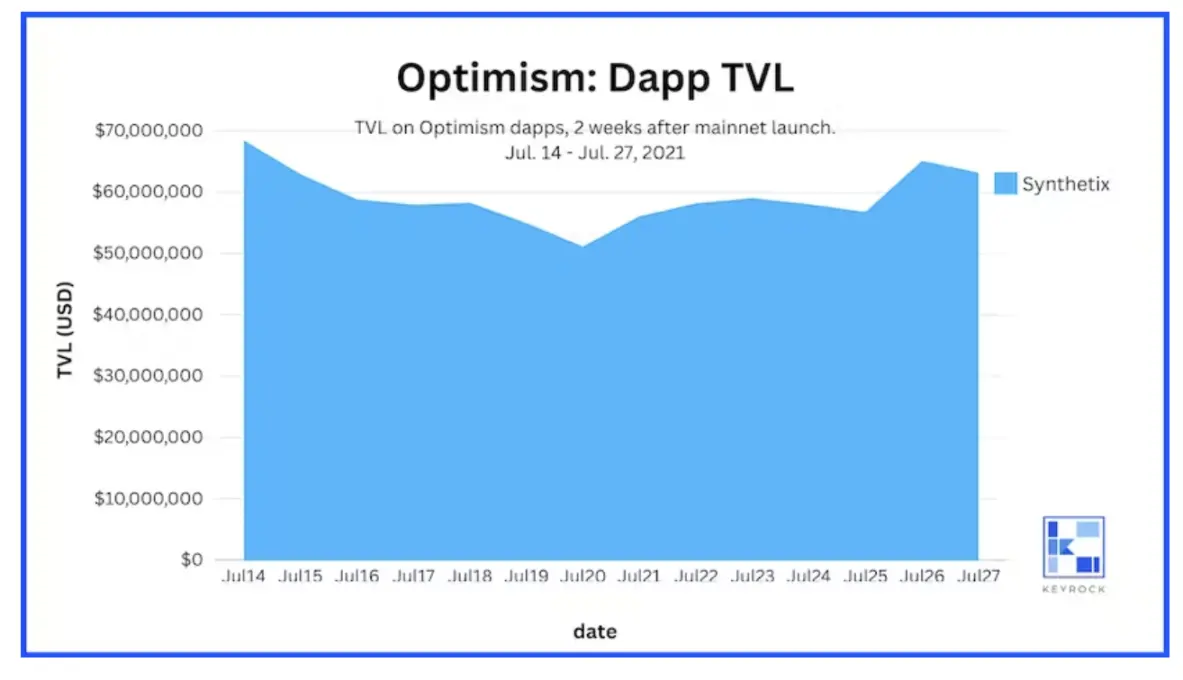 Optimism 在 2021 年分阶段推出了其 L2 网络。7 月 14 日是 Optimism 宣布对 Uniswap 提供支持的一个重要时刻。有趣的是,在这一消息发布后的两周内,Optimism 的应用 TVL 仍然完全由 Synthetix 主导。