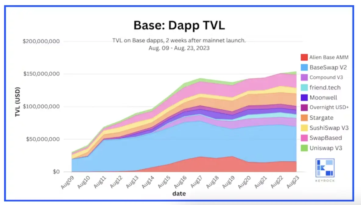 我们在 2023 年 8 月 9 日 Base 主网启动后的两周观察了应用程序 TVL。