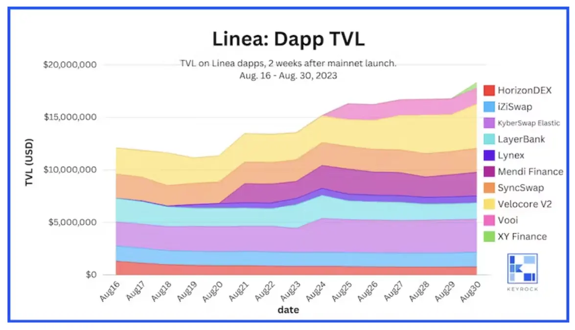我们在 2023 年 8 月 16 日 Linea 主网启动后的两周观察了应用程序 TVL。