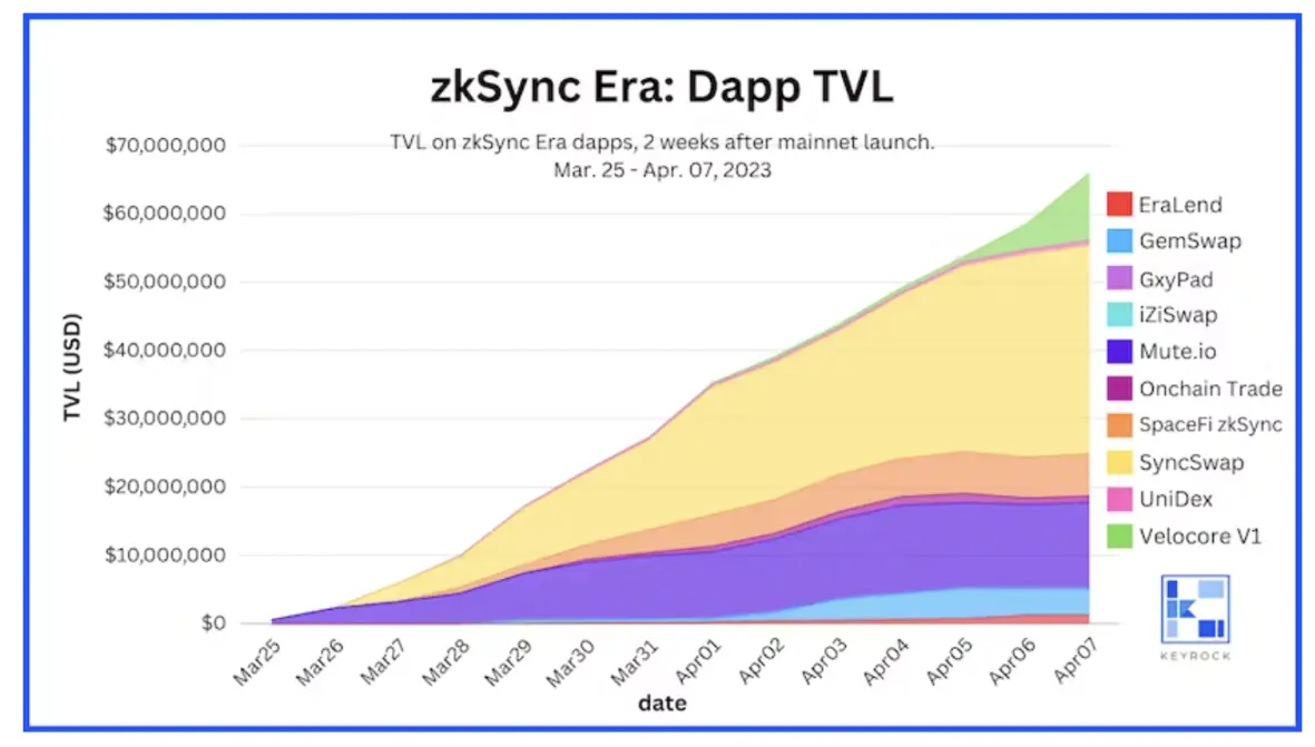 我们在 2023 年 3 月 23 日 zkSync Era 主网启动后的两周观察了应用程序 TVL。