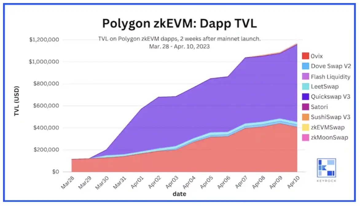 我们在 2023 年 3 月 27 日 Polygon zkEVM 主网启动后的两周观察了应用程序 TVL。