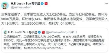 此外,孙宇晨在 10 月 26 日 公布了旗下所有公司的整体盈利情况:「三季度实际收入为 2.02 亿美元,支出为 1.04 亿美元,盈利为 9800 万美元,环比增长 14%。」