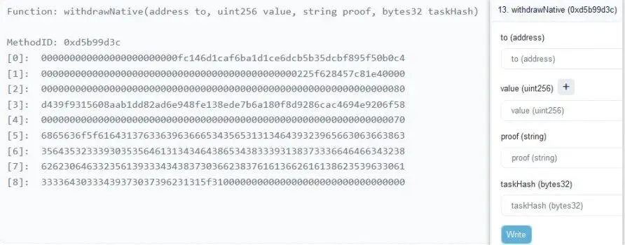 攻击者所交互 Heco Bridge 合约代码显示,攻击者所使用的函数 withdrawNative 可以向指定地址转出指定金额,但需要一系列验证代码。