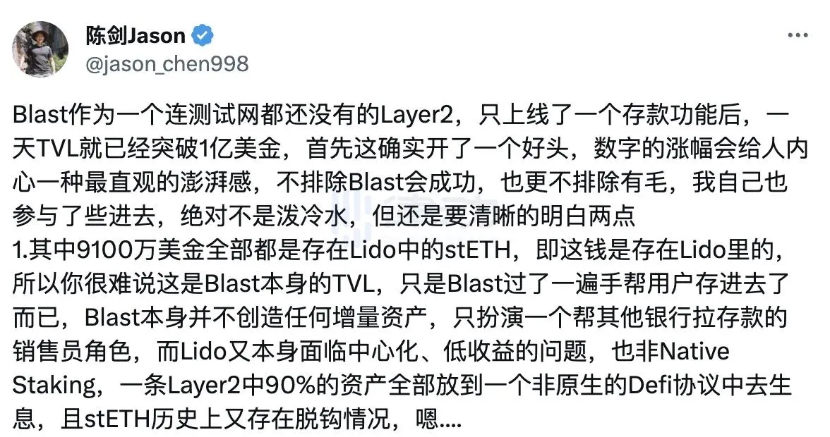 万物研究院的陈剑 Jason(@jason_chen998)也持类似的观点,认为虽然 Blast 存在种种问题,但也不影响用户参与进去。他在社交平台上发表动态指出,不排除 Blast 会成功,也更不排除有毛可薅,他自己也参与了些进去,但用户需要清晰地了解到其中的风险。