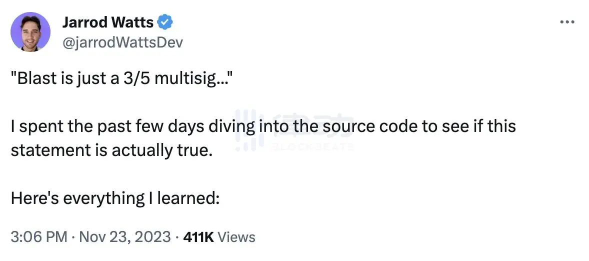 他表示,确实如 Jarrod Watts 所说,Blast 的合约是一个可升级合约,控制权属于一个 3/5 多签(不知道 5 个人分别是谁)且没有时间锁。如果项目方要跑路,要么多签升级个恶意的逻辑合约,要么 enableTransition 设置个恶意的 mainnetBridge。
