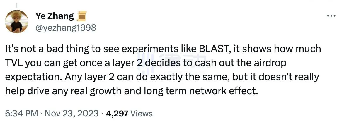 11 月 23 日,Layer 2 网络 Scroll 联创 Ye Zhang(@yezhang1998)在社交媒体上发文表示,像 Blast 这样的(项目)并不是一件坏事,它向人们展示了,一旦 L2 决定兑现空投期望的时候,可以获得多少 TVL。任何 L2 都可以做完全相同的事情,但它并不能真正帮助推动任何真正的增长和长期效应。