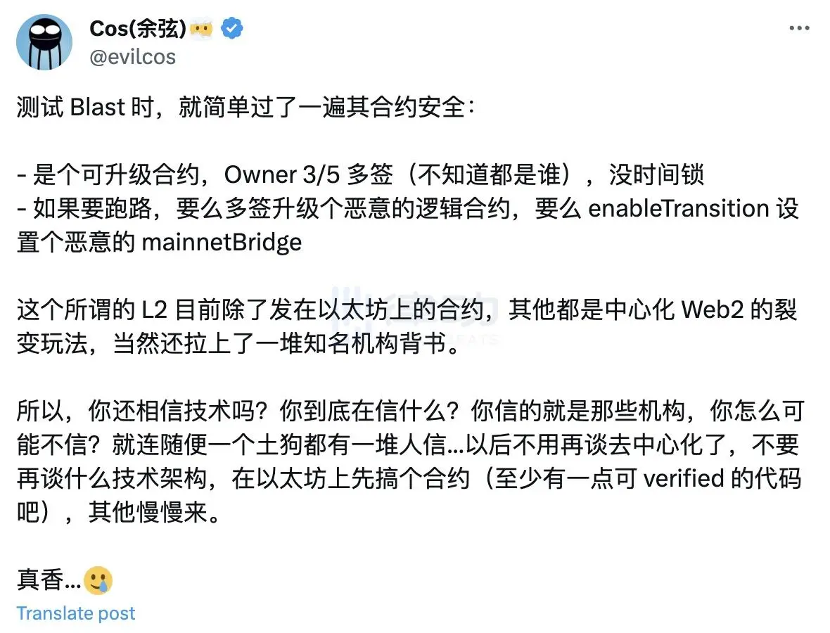 对此,慢雾创始人余弦(@evilcos)也指出,Blast 的确存在跑路的可能性,但这并不妨碍社区积极参与:「Blast 这个所谓的 L2 目前除了发在以太坊上的合约,其他均为中心化 Web2 项目的裂变玩法,但有若干知名机构背书。用户还是比较相信机构背书的项目的。」