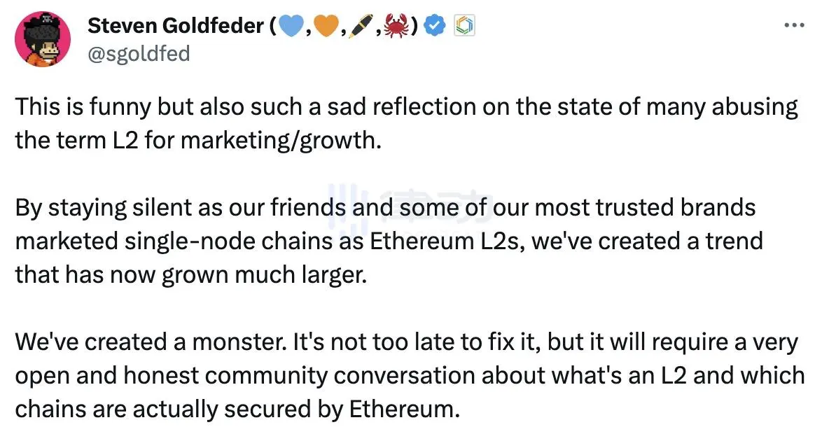 Arbitrum 母公司 OffChain Labs 首席执行官 Steven Goldfeder(@sgoldfed)对于许多人滥用 L2 一词进行营销 / 增长的现状感到悲哀。同时他指出,当我们将单节点链作为以太坊 L2 进行营销时,「我们保持沉默,我们创造了一种趋势」,而现在这种趋势已经变得更大。