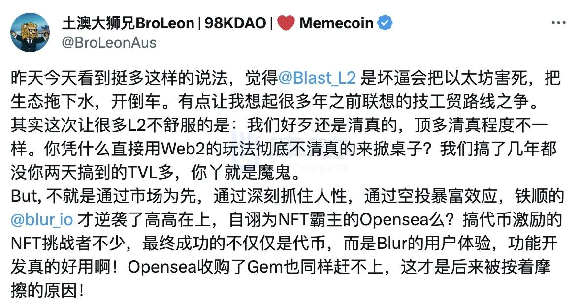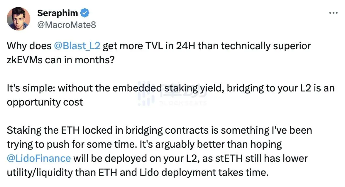 Lido DeFi 拓展负责人 Seraphim(@MacroMate8)相比而言并没有土澳大狮兄那般高歌猛进,但他却认为 Blast 带来的浪潮将会成为引领 L2 未来变革的风向。