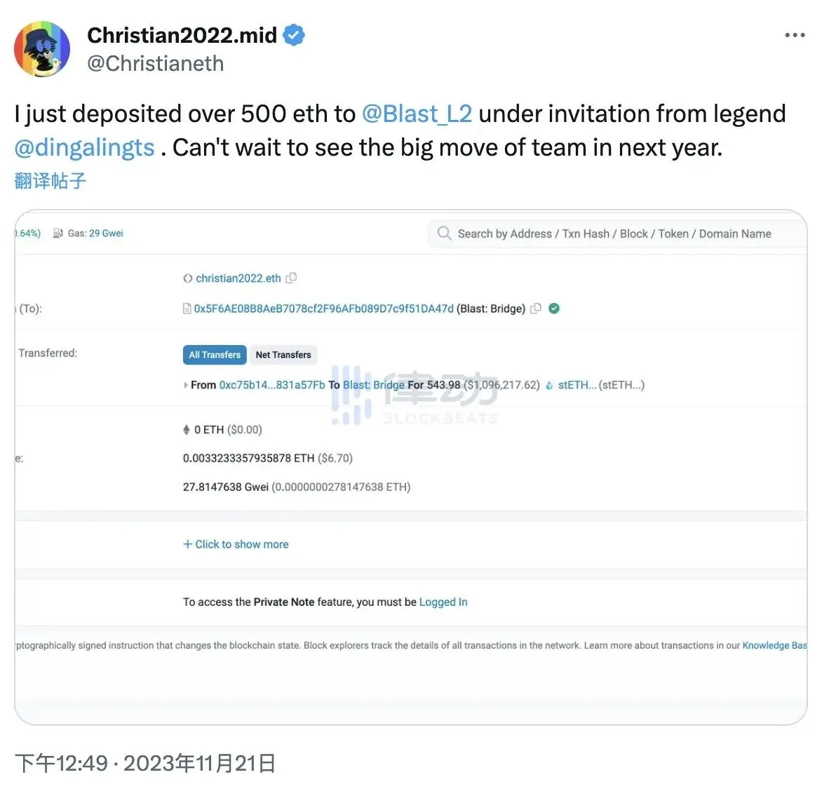 与此同时,加密基金 NDV 联合创始人、NFT 巨鲸 Christian(@Christianeth)也在社交媒体宣布,应另一知名 NFT 巨鲸 dingaling 的邀请,已向 Blast 存入逾 500 枚 ETH。同时,Christian 还表示对 Blast 团队在来年的表现寄予厚望。
