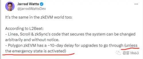 让人感到诧异的是,Optimism 过去只是用一个 EOA 地址管理合约升级,连多签都是今年 10 月才加上去的。至于曾对 Blast 展开抨击的 Polygon zkEVM,也可以在 6/8 多签授权下,对 Rollup 合约进行「紧急接管」,把 Layer2 从合约治理转为「赤裸裸的人治」。有趣的是,上文中对 Blast 进行批判的 Polygon 工程师也提到了这一点,但表现的含糊其辞。