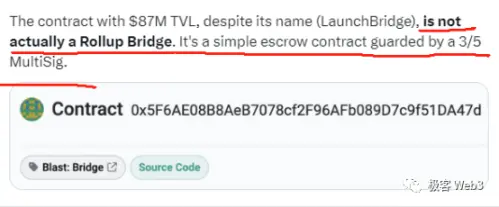 但 Blast 在获得阶段性成功的同时,也引来了许多专家的质疑。比如,L2BEAT 和 Polygon 工程师均一语道破:目前的 Blast 只是在以太坊上部署了接收充值的 Deposit 合约而已,这个合约可以在 3/5 多签的控制下升级,换句话说,合约的代码逻辑可能被改写,想 Rug 还是可以 Rug。同时,Blast 只是自称要实现 Rollup 结构,但现在的它只是一个空壳子,连提款功能都要等到明年 2 月上线。