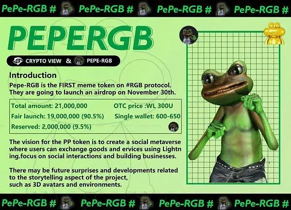 PepeRGB是首个RGB发行代币的项目,目前场外白名单300U左右,我觉得需要诟病的就是名字不够原创,而项目愿景是创建一个社交元宇宙,用户可以使用闪电网络交换真实的商品和服务,将不涉及土地销售,而是专注于社交互动和建立企业。