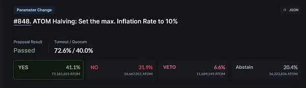 11 月 26 日,Cosmos Hub 社区经过惊险的投票反转,终于在最后时刻通过**「ATOM 减产:将最大通胀率设置为 10%」**提案,这也意味着 ATOM 最大通胀参数将从 20% 降低至 10%,使 ATOM 当前的通胀率降至 10%,并将 staking 年利率从 19% 降至 13.4%。