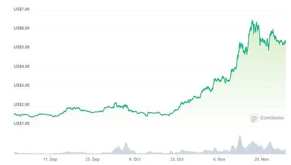 从 10 月开始,RUNE 已经最高涨了 4 倍有余,总市值来到 16 亿美元的体量,这已经是 Cosmos 生态中首屈一指的庞然大物。