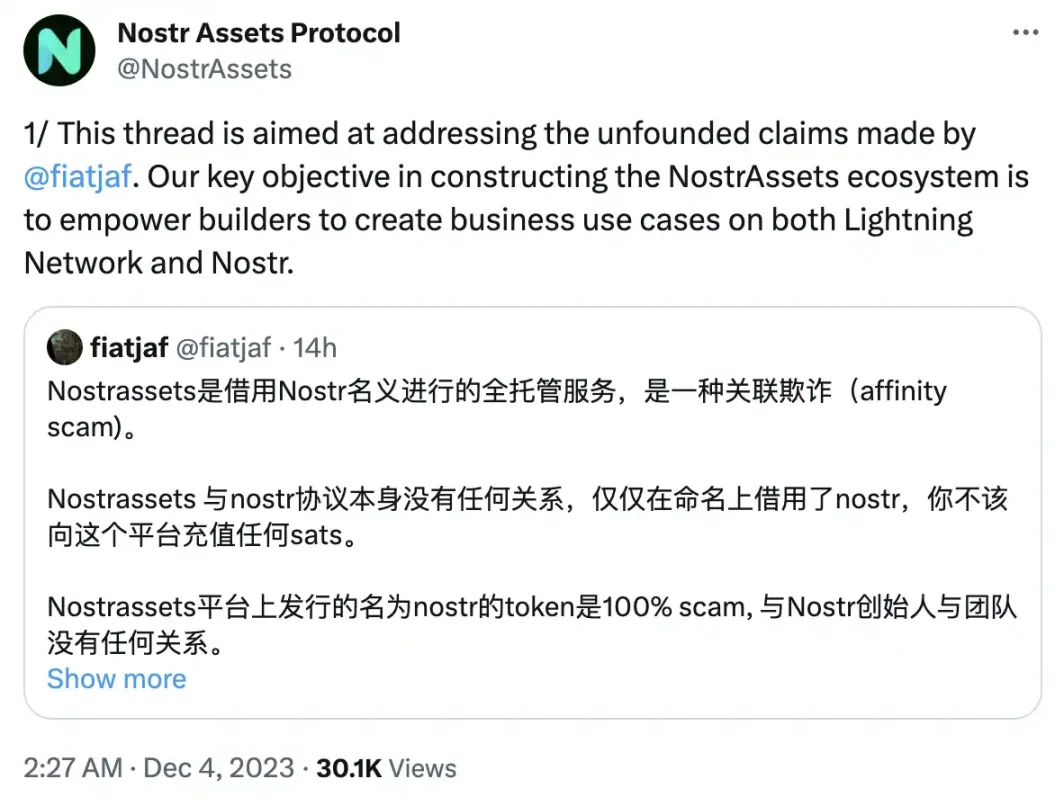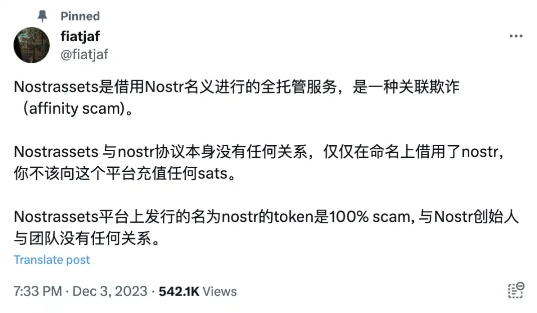 12 月 3 日晚间,Nostr 协议创始人 Fiatjaf(@fiatjaf)在社交平台上用中文发表动态表示:「Nostr Assets Protocol 是借用 Nostr 名义进行的全托管服务,是一种关联欺诈(affinity scam)。Nostr Assets Protocol 与 Nostr 协议本身没有任何关系,仅仅在命名上借用了 Nostr。」