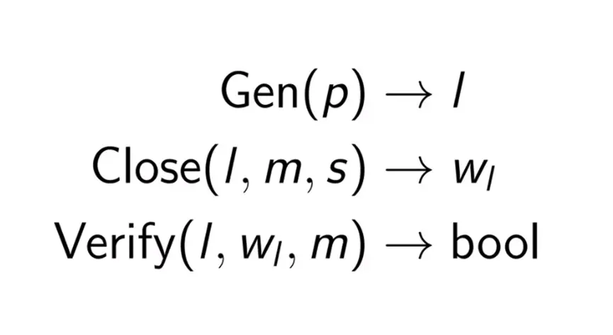 • Verify(l, w, m)→bool:验证消息 M 上的密封 L 是否已关闭。