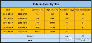分析过去的周期,以前熊市周期的中位数跌幅为 -77%(平均跌幅约为 -75%)。最近的熊市周期正好下跌了 77%。另一方面,牛市周期的中位数价格增幅为 15 倍(平均增幅约为 60 倍)。