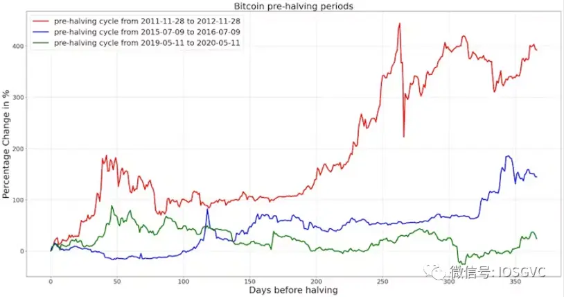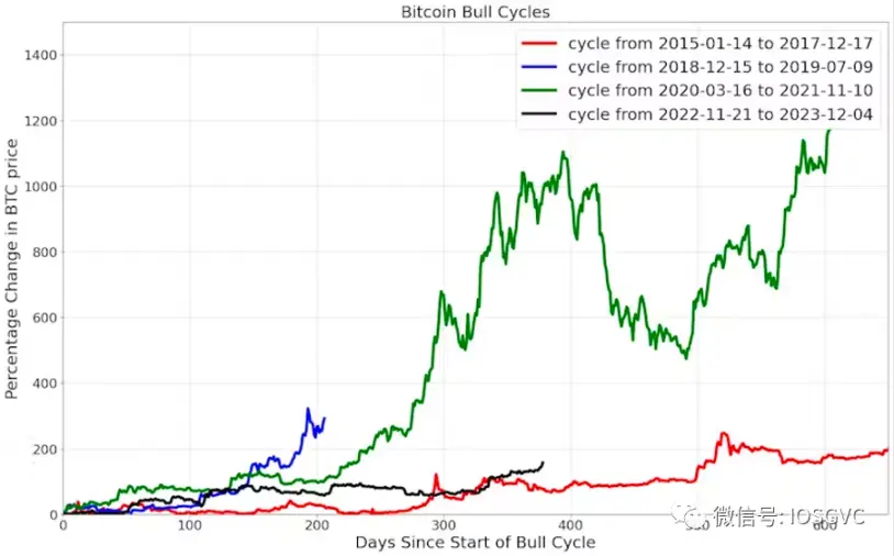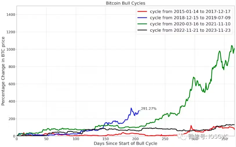 当前的牛市周期持续一年左右。下面我们将在类似的时间窗口内,将比特币在本轮周期与前几个周期的回报率进行对比。