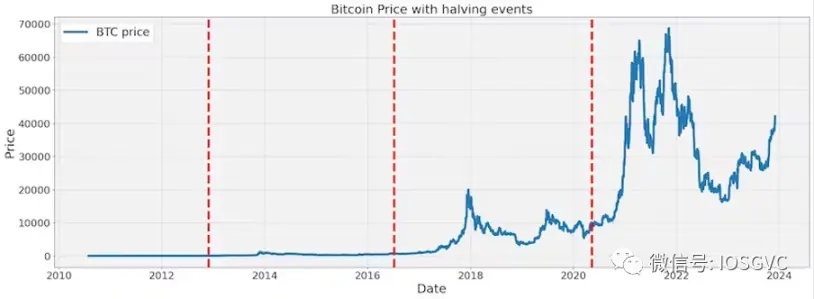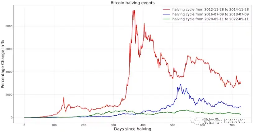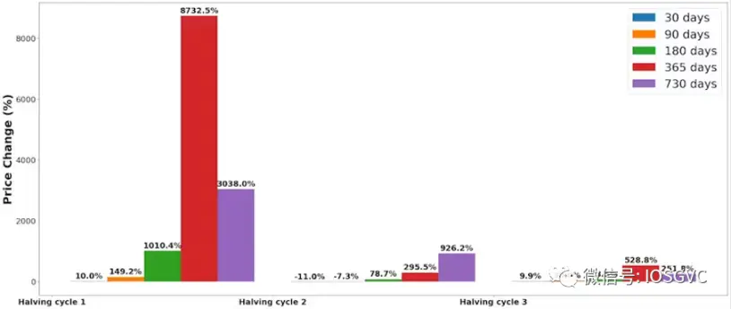 这些周期清晰可见,似乎与减半事件有关,从下图中可以清楚地看到减半事件后 BTC 价格的变化: