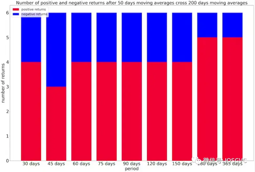 纵观比特币价格的整个历史上,50 天 MA 仅在 6 个实例中跨越了 200 天 MA。从概率上讲,可以预测超过 80% 的可能性(历史上 6 次事件中的 5 次),在交叉发生的一年后会有正收益回报。