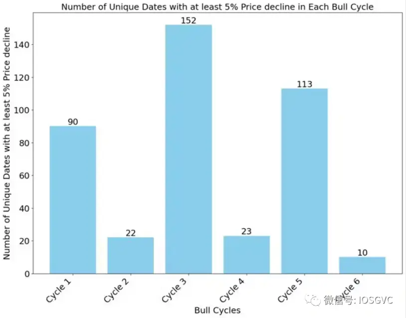 在比特币走向顶峰的过程中,上一轮周期经历了近 115 次 5% 或以上的每日修正(这里我们将负收益称为修正),而本轮周期只经历了 10 次这样的修正。即使是持续时间较短的周期,其修正次数也多于本轮周期。