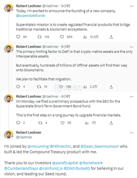 2023 年 6 月 28 日,据 Blockworks 报道,获得了 400 万美元的股权融资,参与此轮融资的投资者包括 ParaFi Capital、1kx、Cumberland Ventures、Coinfund 和 Distributed Global。 2023 年 6 月 29 日,Compound 创始人兼 CEO-Robert Leshner 宣布成立新公司 Superstate ,该公司瞄准当下热点领域 RWA,他们致力于购买短期美国国债并上链,通过区块链做二次记录,直接在链上交易流转基金的所有权份额。